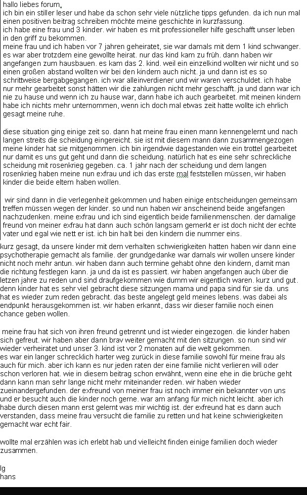 Die Diskussion über Fremdgehen, Kämpfen um kaputte Beziehungen usw. ist zwar sehr interessant, war aber nicht der Grund meines postings hier.